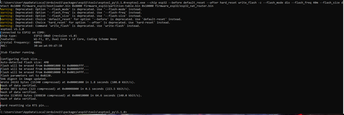 esptool.exe --chip esp32 --before default_reset --after hard_reset write_flash -z --flash_mode dio --flash_freq 40m --flash_size detect 0x1000 firmware_esp32/bootloader.bin 0x8000 firmware_esp32/partition-table.bin 0x10000 firmware_esp32/esp32_nat_router.bin